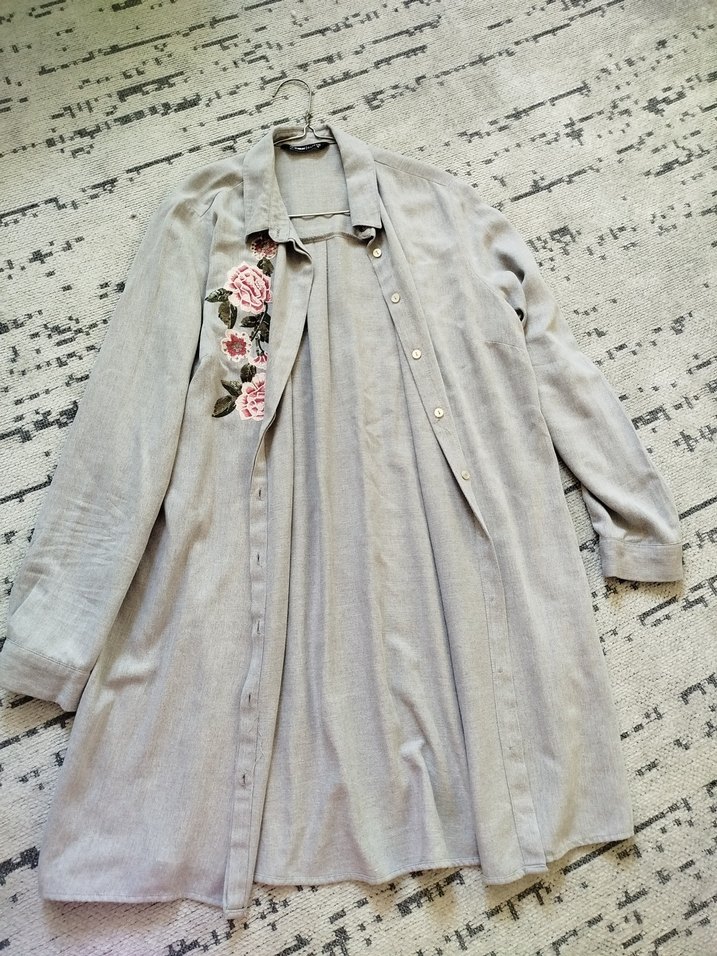 Gevşek kesim, uzun kollu gri keten gömlek, düğmeli ve nakışlı çiçek detaylarına sahip. Notlu yaka ile bohem tarzı için uygun.