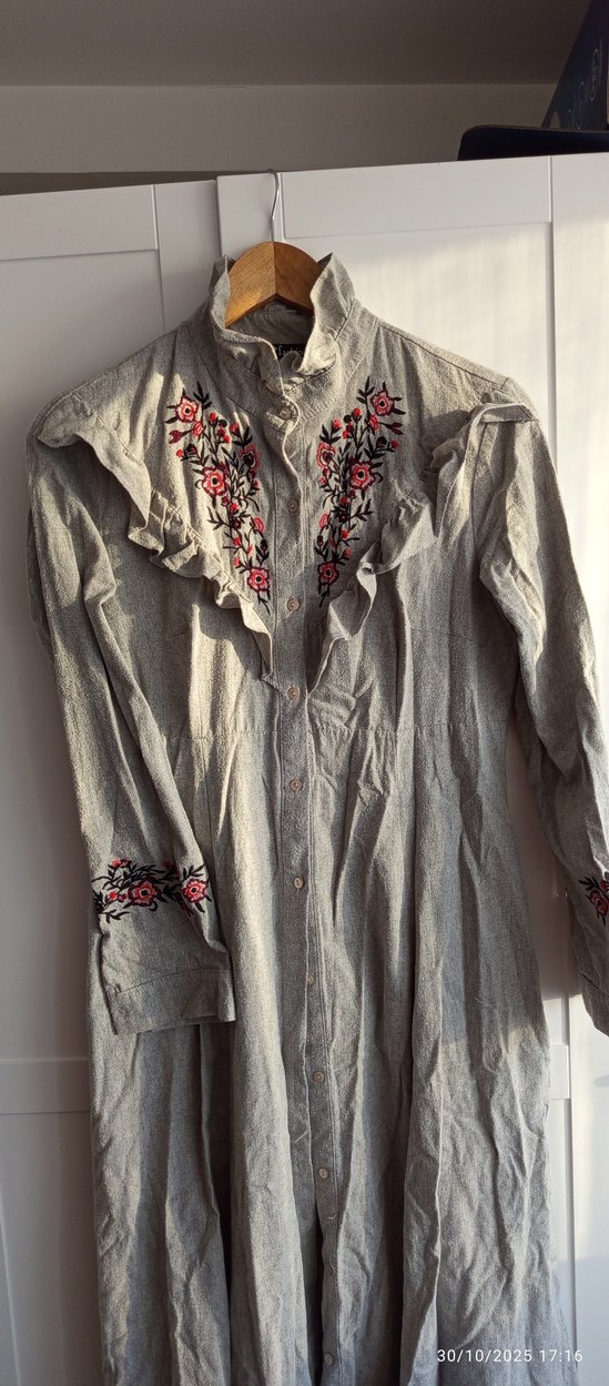 Nakışlı çiçek desenleri ve düğmeli ön kısmı ile bol kesim uzun keten gömlek elbise Yaka ve uzun kollu, bohem tarzını yansıtıyor. az kullanıldı kuşağı da var