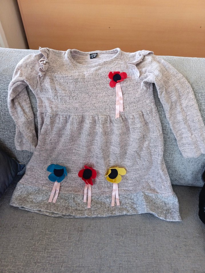Gri renkli, uzun kollu, örgü kumaştan yapılmış, nakışlı çiçek desenleri ve renkli kurdele detayları bulunan bol kesim kız elbisesi.
