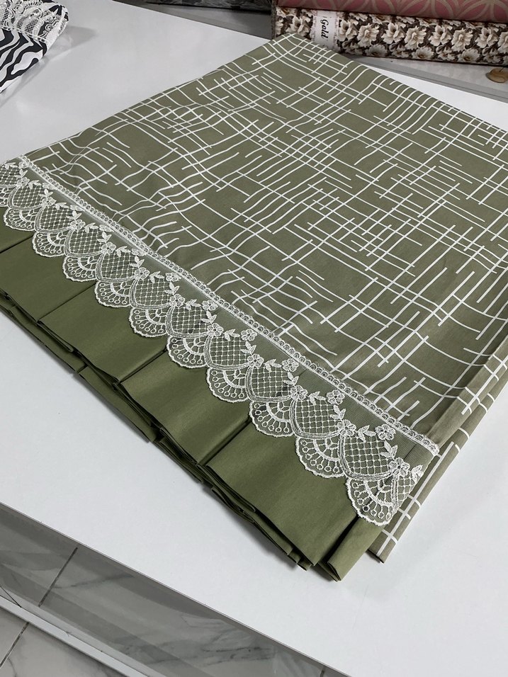 Haki renkte, gri geometrik nakışlı ve dantel detaylı çarşaf yatak odanıza zarif bir dokunuş katıyor. ️ Büzgü detayı yatağın ayak tarafına gelmektedir. 240-250 cm ebatında. Dilediğiniz ölçüde dilediğiniz şekilde dikim yapılabilir