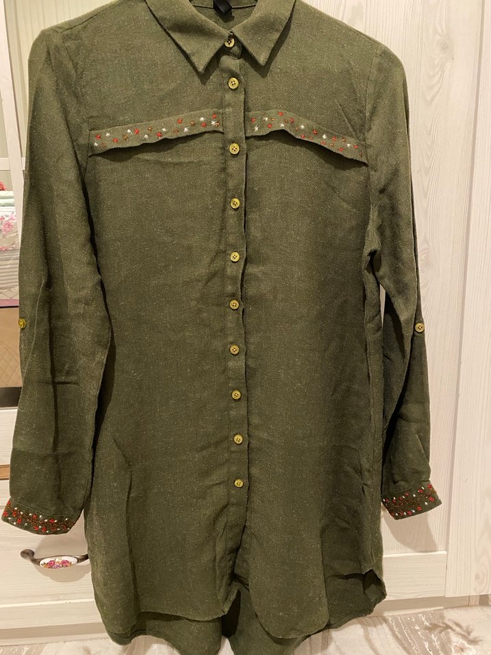 Bohem tarzı, keten kumaştan uzun kollu, yakası kesik ve düğmeli kadın gömleği. Göğüs ve manşetlerde nakış detaylı, bol kesim, parlak haki renkte. Günlük kullanıma uygun.