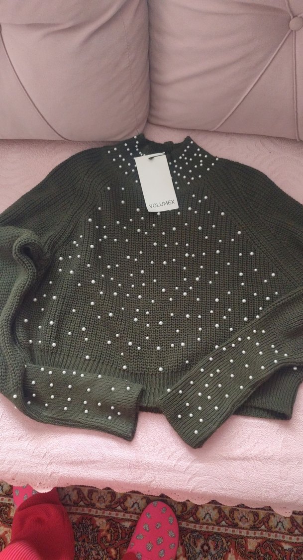 haki renkli, uzun kollu ve yuvarlak yaka kadın triko kazak. Nakışlı detaylarıyla rahat ve trend sokak stiline uygun, günlük kullanıma ideal. markası temsili