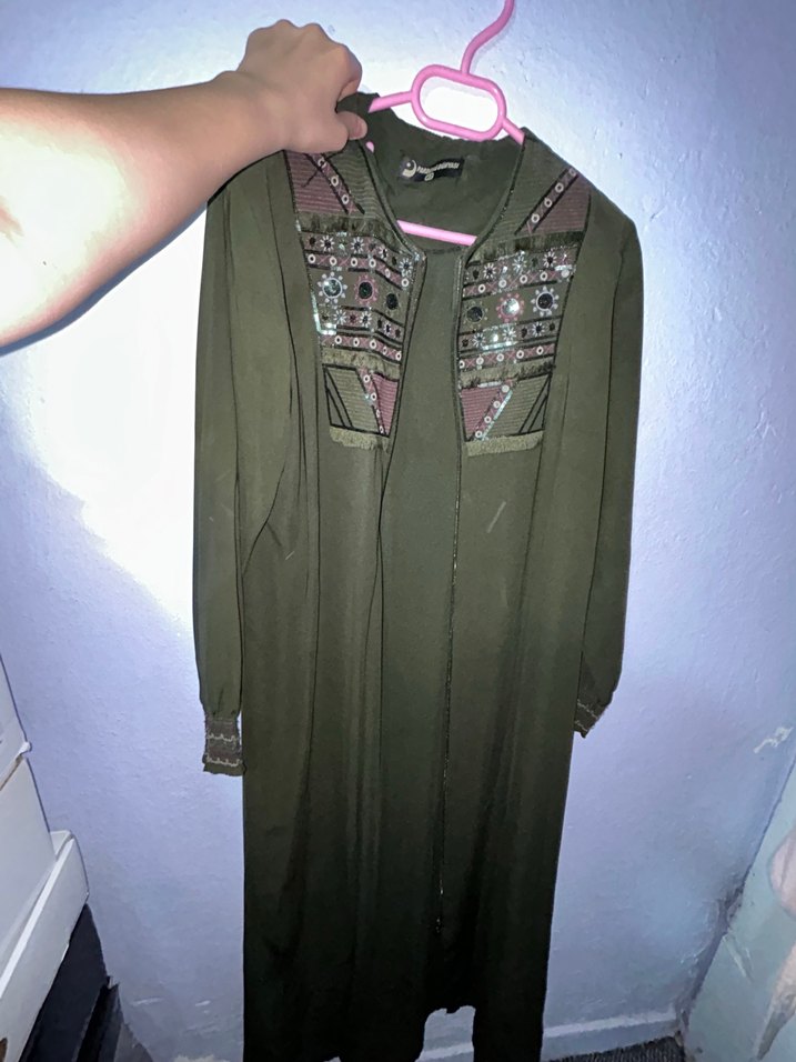 Bohem tarzda, uzun ve salaş kesim, uzun kollu, yakası kesimli. Sentetik kumaş, nakışlı desenler göğüs ve manşetlerde, koyu haki renkte. Günlük kullanıma uygun.