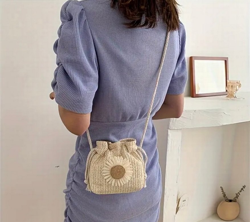 Nakışlı hasır papatya desenli beyaz çanta