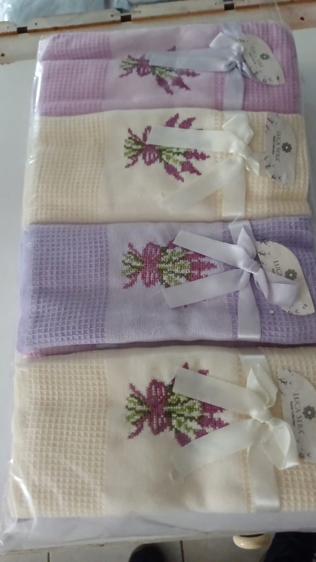 Nakışlı çiçek desenli, lila ve krem renklerinde, klasik tarzda havlu seti. Saten kurdele ile bağlanmış.