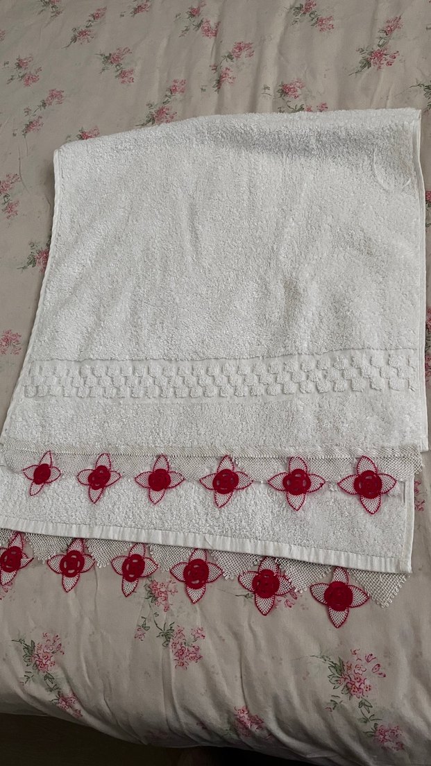 Nakışlı ve dokulu bantlı beyaz havlu, kenarında kırmızı çiçek danteli detayına sahiptir. Yumuşak ve emici kumaştan üretilmiştir. Hiç kullanılmadı. Marka temsilidir