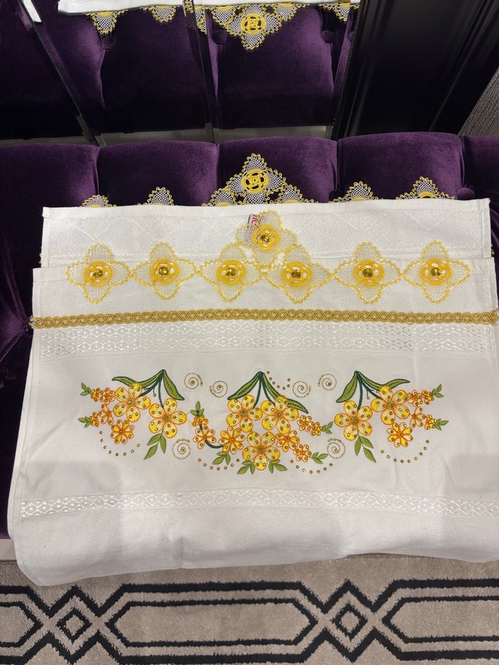 Beyaz havlu, renkli çiçek nakışları ve sarı dantel süslemeleriyle geleneksel tarzı canlı detaylarla buluşturuyor.