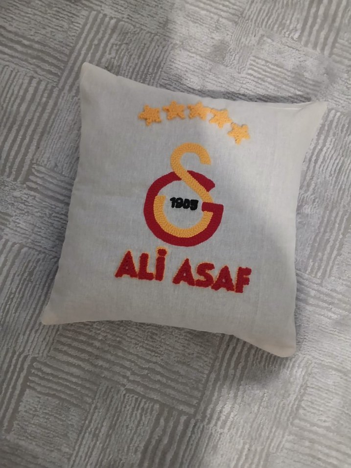 Galatasaray logosu, yıldızlar ve 'ALi ASAF' ismi nakışlı gri yastık kılıfı. Geleneksel tarzda, detaylı işçilikle hazırlanmıştır. ️ istenilen isim ve takım yapılır