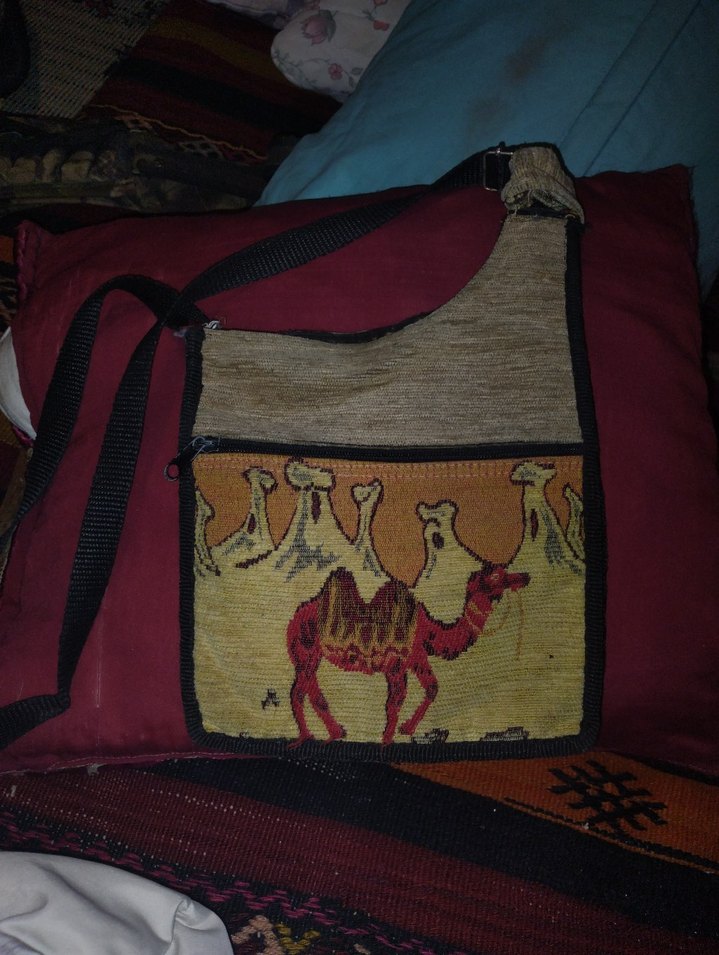 Nakışlı desenlere sahip, fermuarlı, tekstil malzemeden yapılmış camel renk çapraz kadın çantası. Bohem