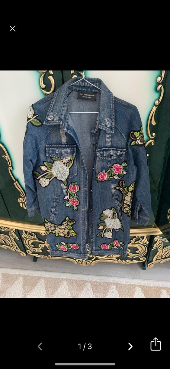 Nakışlı Kadın Kot Ceket, Salaş Kesim, Mavi