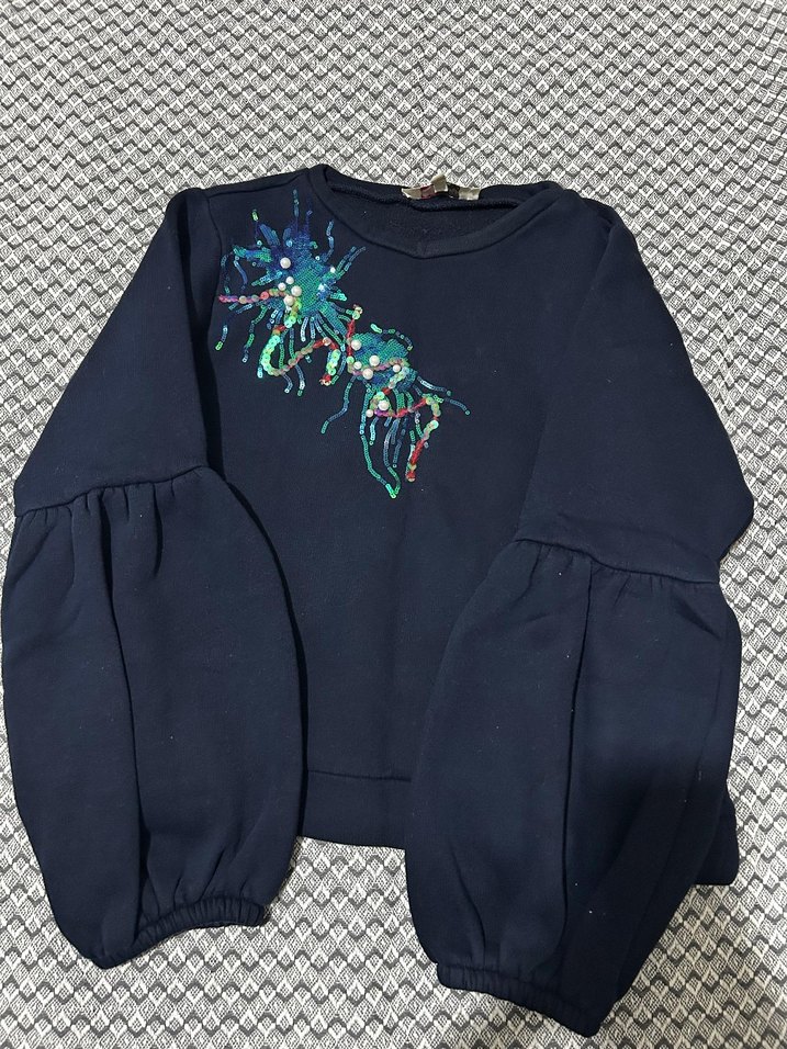 Uzun örme kollu, nakışlı detaylı, yuvarlak yakalı koyu mavi bol kesim mini sweatshirt. Rahat ve şık günlük kullanım için uygun.
