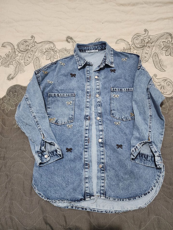 Uzun kollu, düğmeli ve yakalı mavi denim kadın ceket. Nakışlı fiyonk desenleriyle trend sokak stili sunar. Normal midi boy, bol kesim ve ön ceplidir.