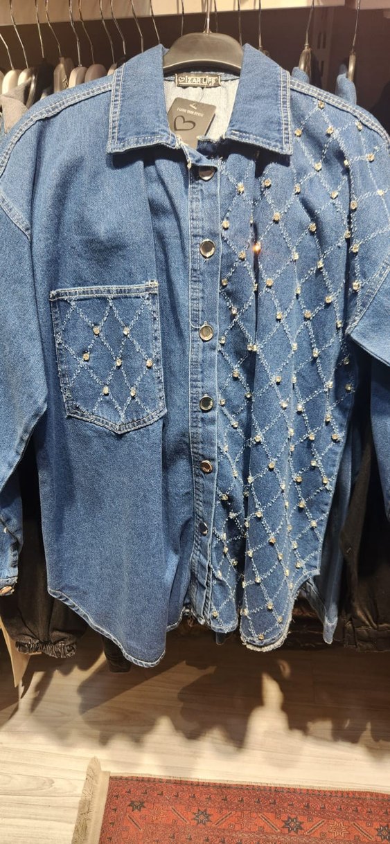 Nakışlı desenlere sahip, düğmeli, normal boy, bol kesim kadın mavi denim ceket. Sokak tarzı için uygun, parlak mavi renkte.