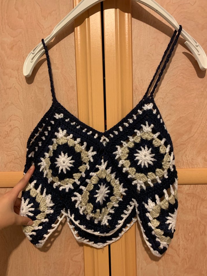Bohem tarzda, V yakalı, askılı, bol kesim kadın örgü crop top. Koyu renklerde çok renkli nakışlı desenli, günlük kullanıma uygun.