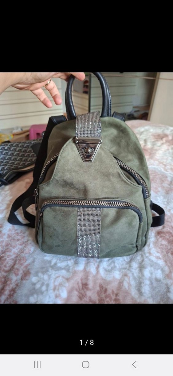 Nakışlı detaylara ve fermuarlı ön cebe sahip haki süet kadın sırt çantası. Biker tarzı, rahat ve trend görünümlü, günlük kullanıma uygun.