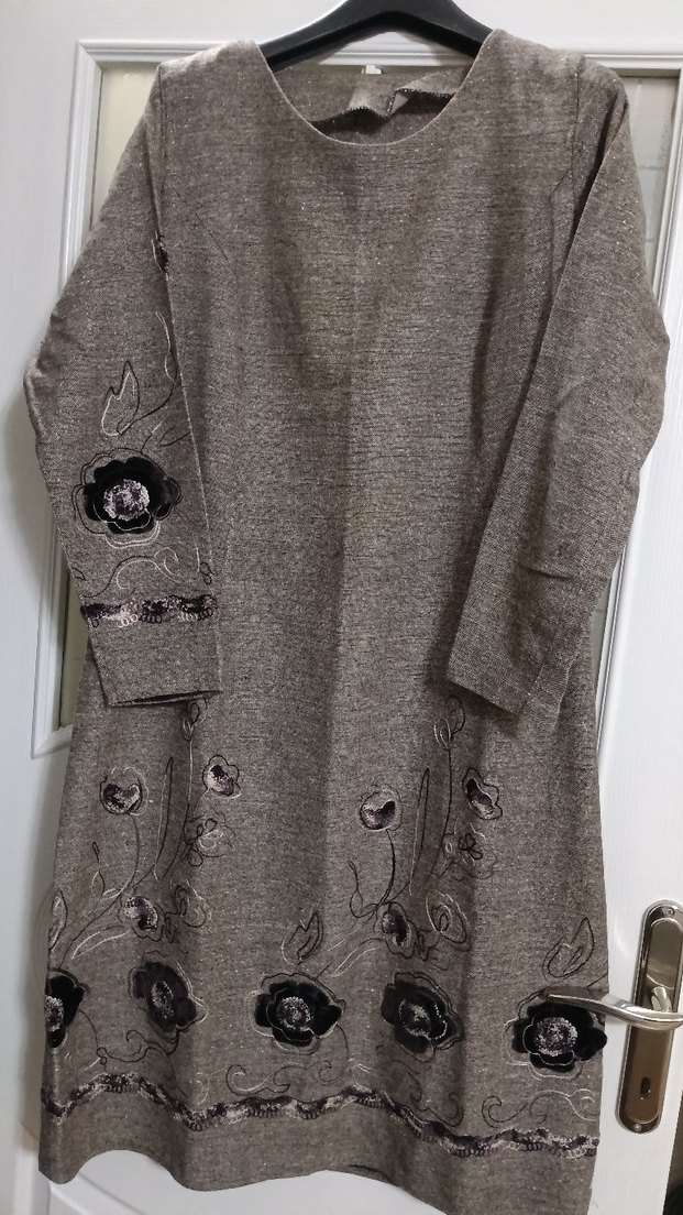 Nakışlı Kahve Diz Altı Elbise