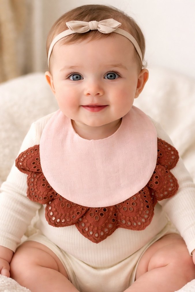 Pastel kahverengi tonlarda, kenarları nakışlı, yumuşak ve şık bebek önlüğü.