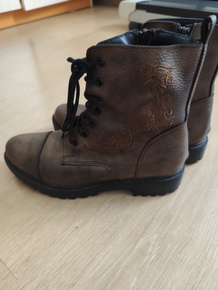 Kahverengi deri kadın bot, kama topuklu ve nakışlı detaylara sahip. Tokalı kayışları ve bağcıklı önüyle rahat, bohem tarzda. Günlük kullanım için uygun.