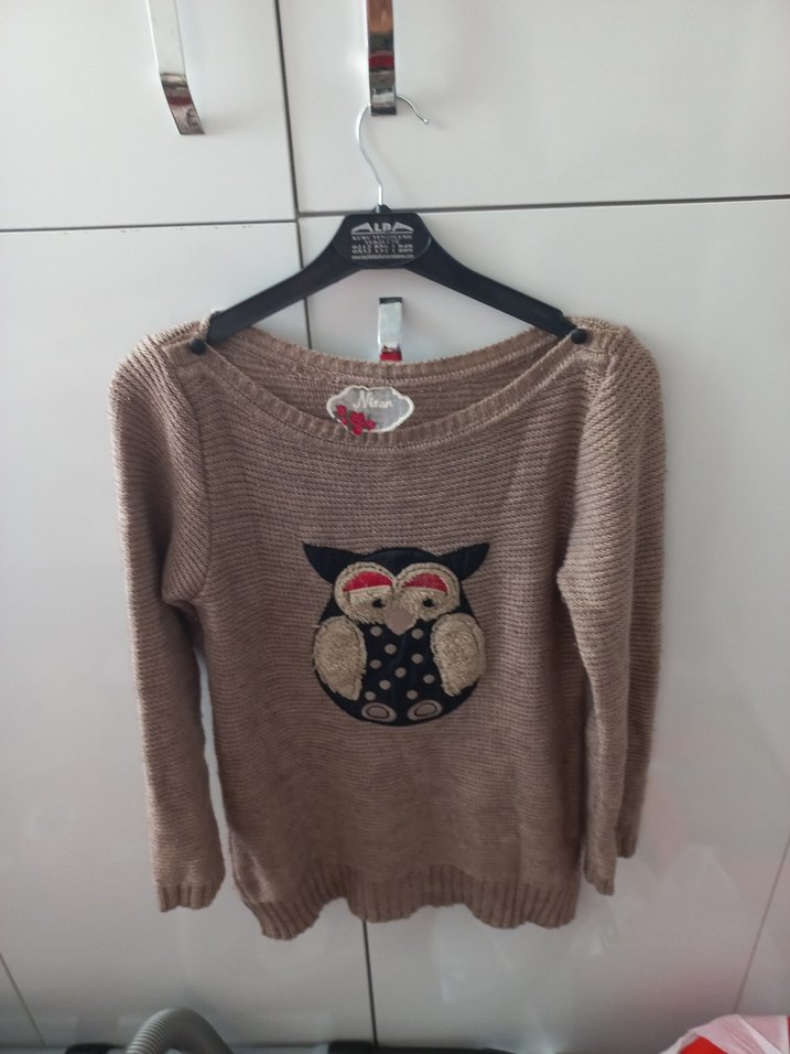 Bu kahverengi triko kazak, uzun kollu ve yuvarlak yakalıdır. Nakışlı baykuş deseniyle rahat ve günlük sokak stili sunar.