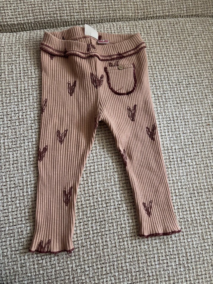 Nakışlı desenli, küçük cepli kahverengi kız çocuk triko tayt. Yumuşak ve rahat, günlük kullanıma uygun.