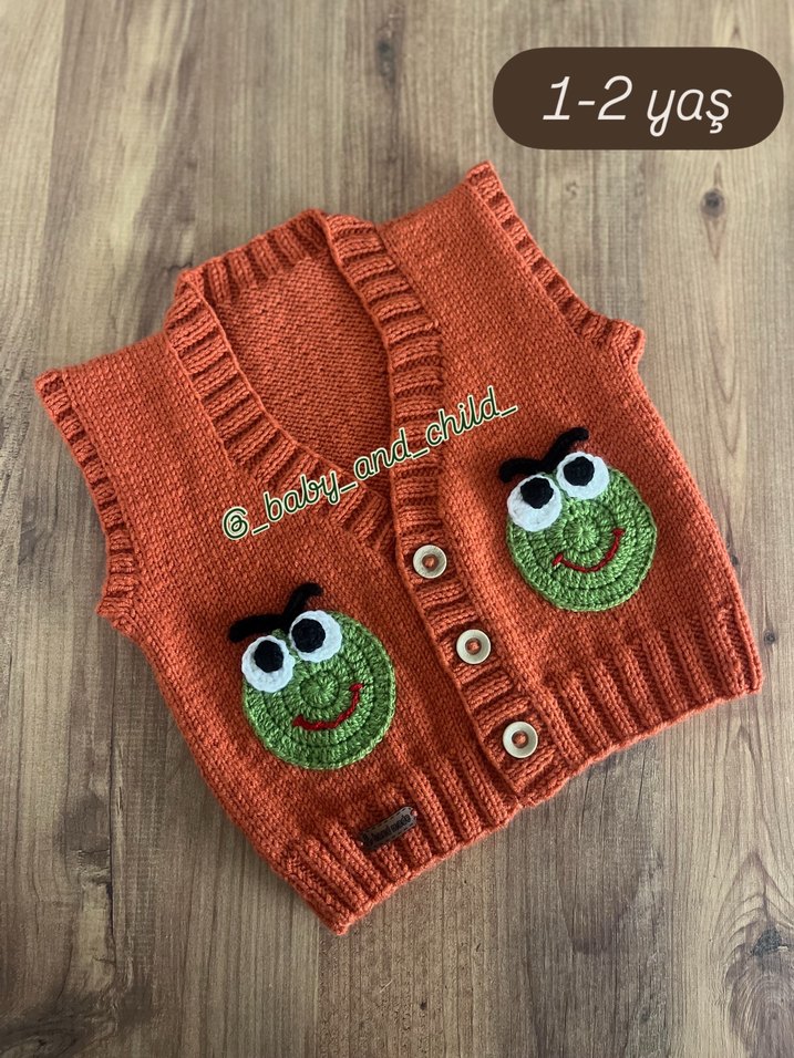 1-2 yaş erkek çocuklar için kahverengi, nakışlı örgü süveter. Renkli kurbağa nakışları ve rahat, bol kesim özellikli.