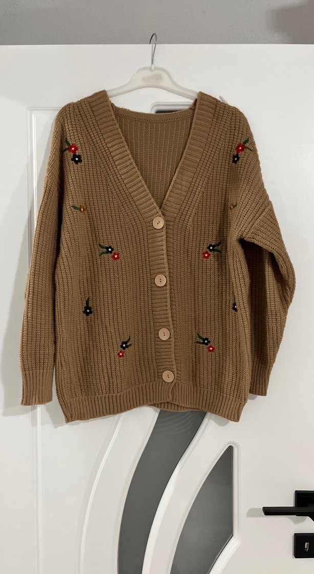 Nakış işlemeli, kahverengi örgü kadın hırka. Uzun kollu, notched lapel yakalı, bol kesim ve midi boyda, rahat ve bohem tarz için uygun.