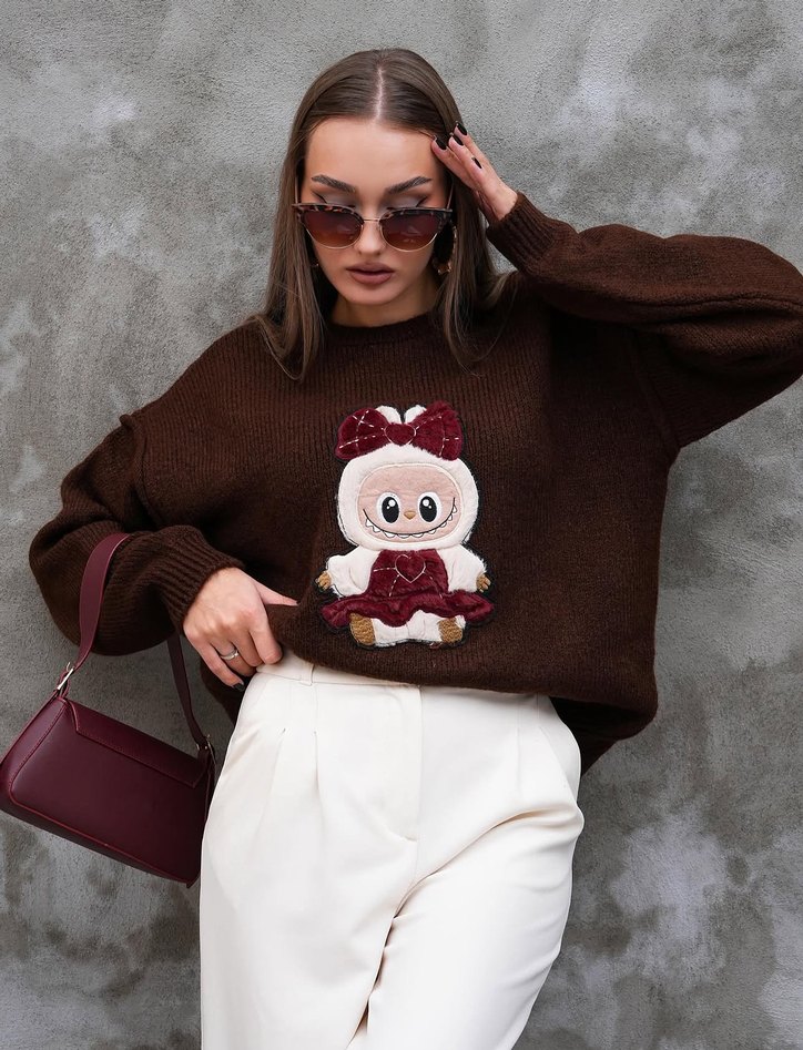 Koyu kahverengi, uzun kollu, yuvarlak yakalı, nakışlı kısa ve bol kesim triko kazak. Rahat günlük kullanım için uygundur.