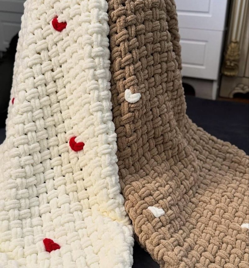 Kalın dokuma kahverengi ve krem renklerde, küçük kırmızı ve beyaz nakışlı kalp detaylı battaniye. Rahat ve dekoratif bir dokunuş sağlar.