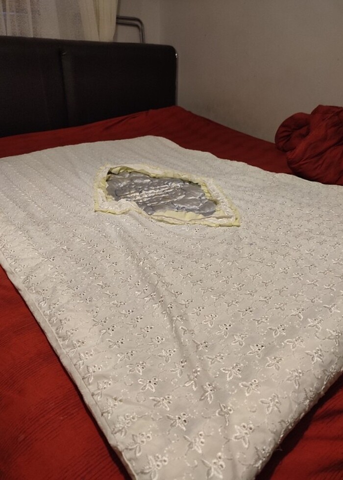 Urunun eni 92 cm boy 133 cm saten yuze sirinmis sadece onunde beklemeden yada gunesten kaynakli resimde belirttigim renk solmasi var Kislik üsutmez