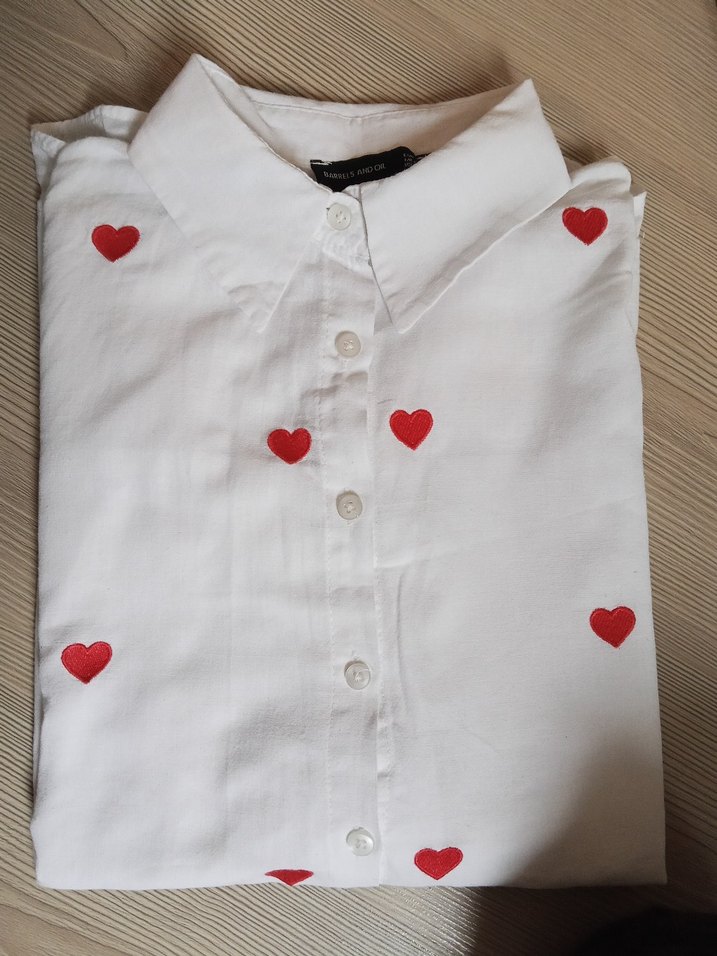 Pamuklu, kısa kollu beyaz kadın gömlek, yakalı ve düğmeli. Kırmızı nakışlı kalp desenleriyle süslenmiş, rahat kesim ve günlük sokak stili için uygun. ❤️