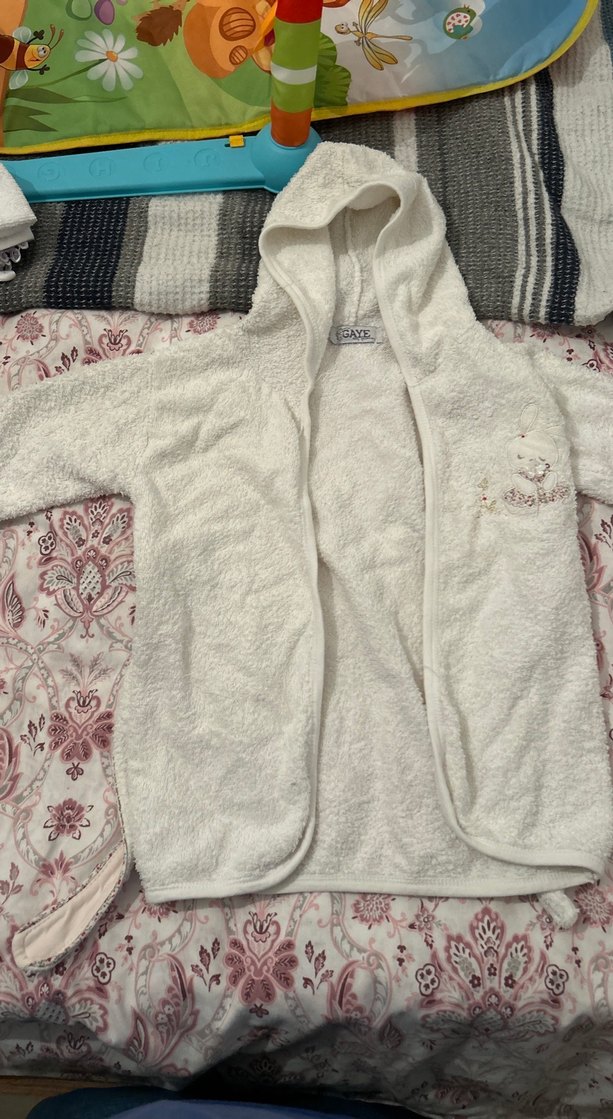 Kapüşonlu, yumuşak ve sıcak beyaz kız çocuk bornozu, gri nakış detaylı. Banyo sonrası kullanım için uygun rahat kumaş.