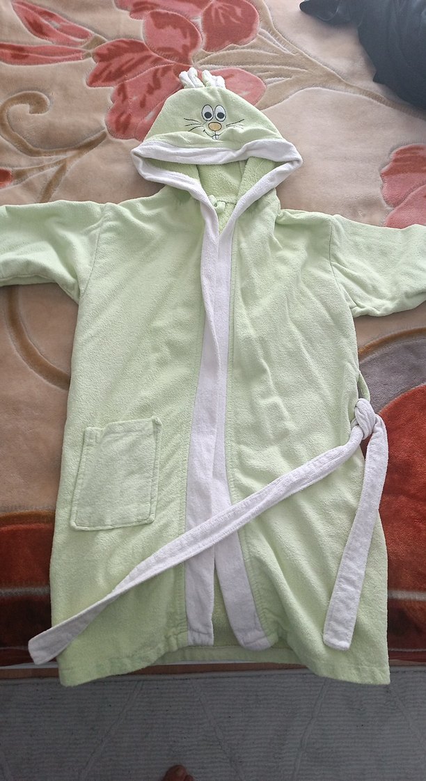 Nakışlı kapüşonlu, pastel yeşil kız bornozu. Yumuşak kumaştan, bel kemeri ve cep içerir.