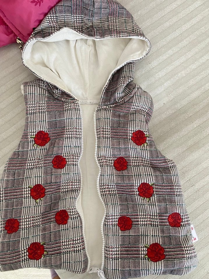 Nakışlı kırmızı çiçek detaylı, düğmeli, kapüşonlu kız yeleği. Kolsuz, fitted kesim ve yumuşak, sıcak kumaştan üretilmiştir. 6 ay