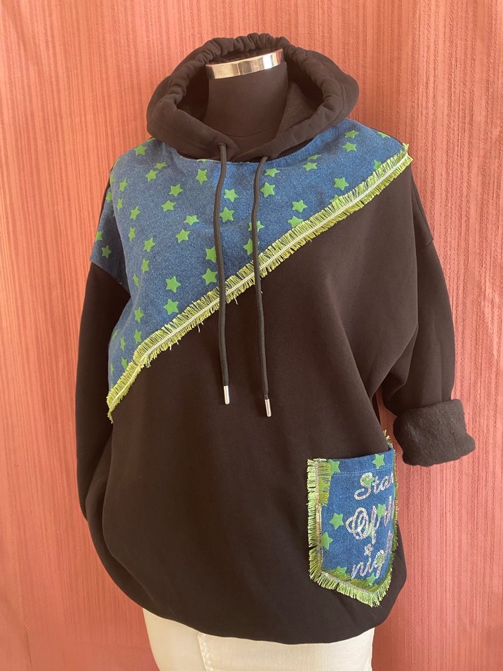 Kadınlar için kapüşonlu, uzun kollu, kısa kesim bol kot sweatshirt. Yeşil yıldız işlemeli kot detaylar ve püskül süslemelerle tasarlanmıştır.