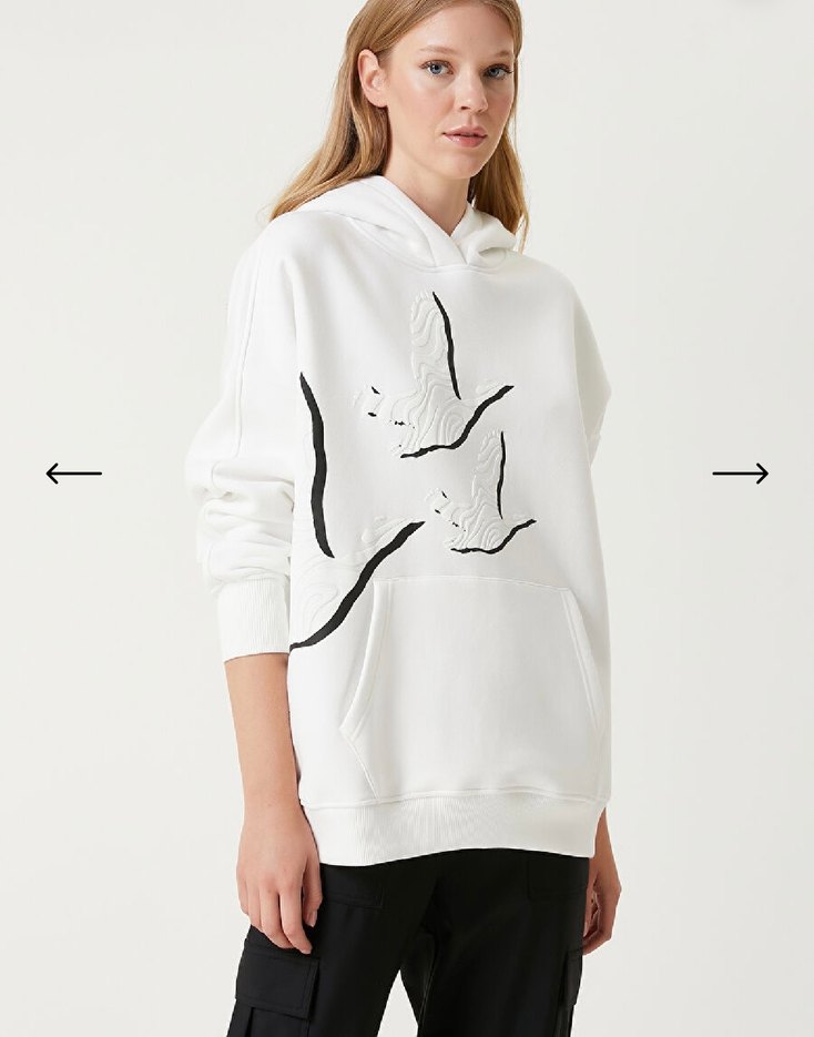 Nakışlı Kapüşonlu Salaş Beyaz Sweatshirt