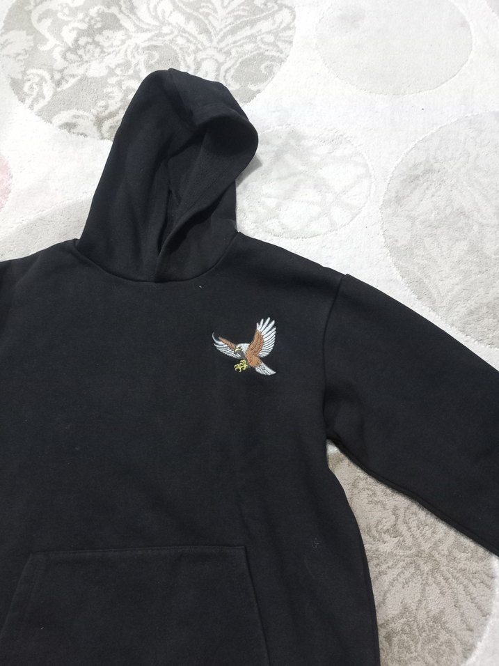 Siyah kapüşonlu sweatshirt, göğsünde nakışlı kartal deseni bulunur. Uzun kollu ve ön cep detaylı, yumuşak ve kalın kışlıktan yapılmıştır. Renk atma ve deforme yoktur.