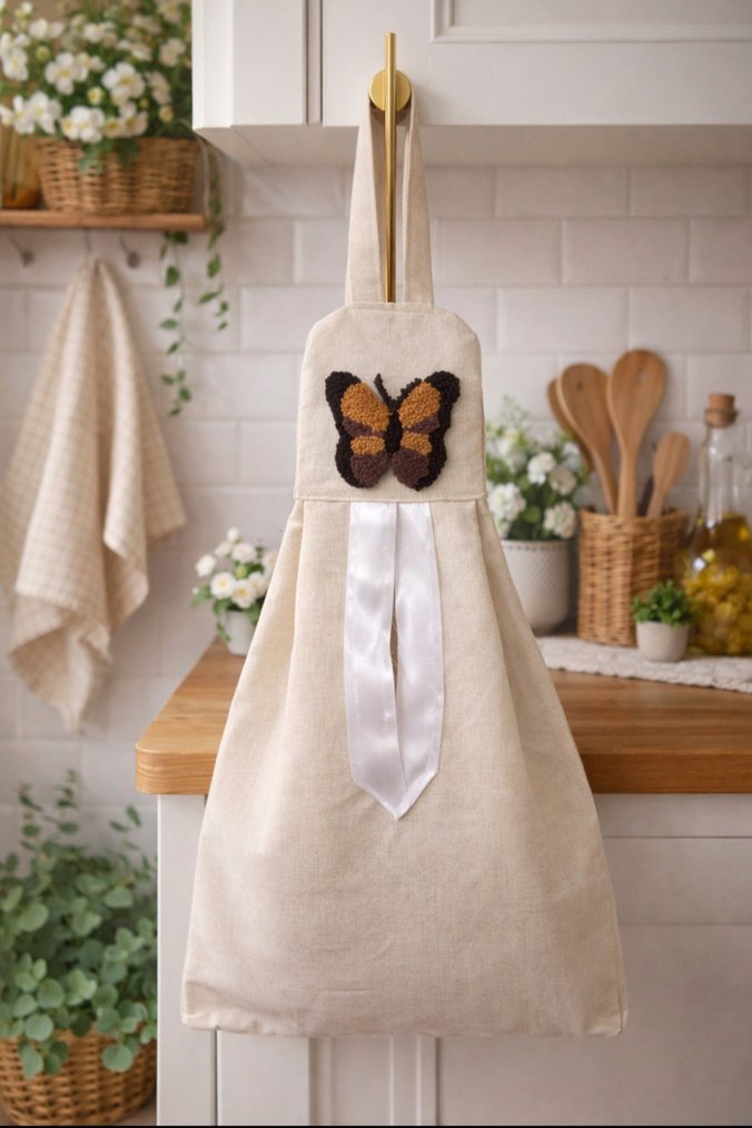 Açık bej renkte, nakışlı kelebek deseni ve beyaz kurdele detaylı poşetlik