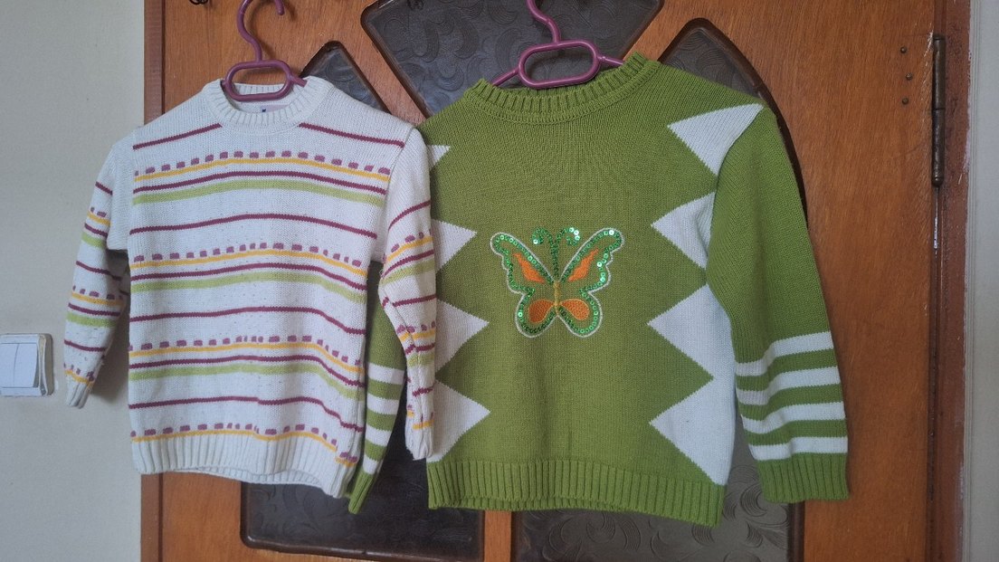 Renkli nakışlı kelebek deseni ve yanlarda zikzak detaylı, uzun kollu, dar kesim kız kazak. ikisi birlikte verilecek 5-6 yaş