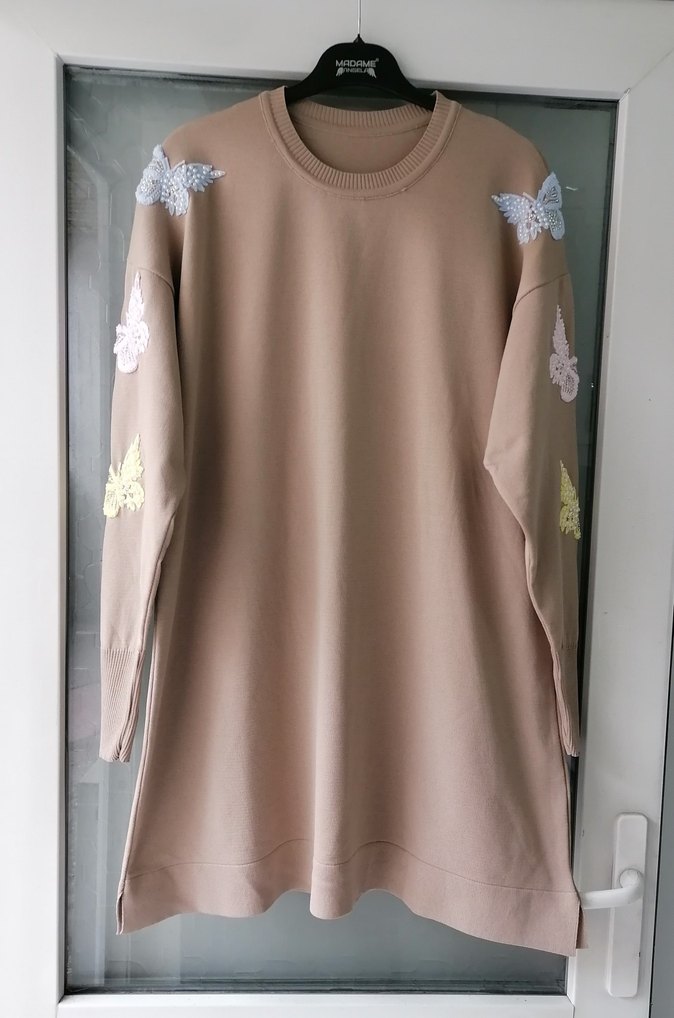 Bej renkli, uzun kollu ve yuvarlak yaka triko tunik. Kollarda nakışlı kelebek detayları bulunur. Salaş kesim ve midi boyda, rahat sokak stili için uygundur.