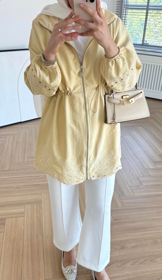 Nakışlı Kemerli Bej Midi Tunik Ceket