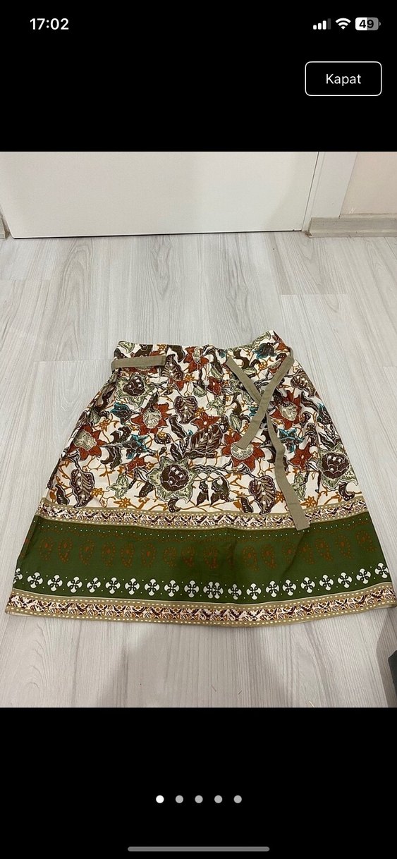 Koyu renkli çok renkli nakış desenleri ve kemerli bel kısmı olan bohem tarzda mini etek. Tekstil kumaştan, bol kesim ve günlük kullanım için uygundur.