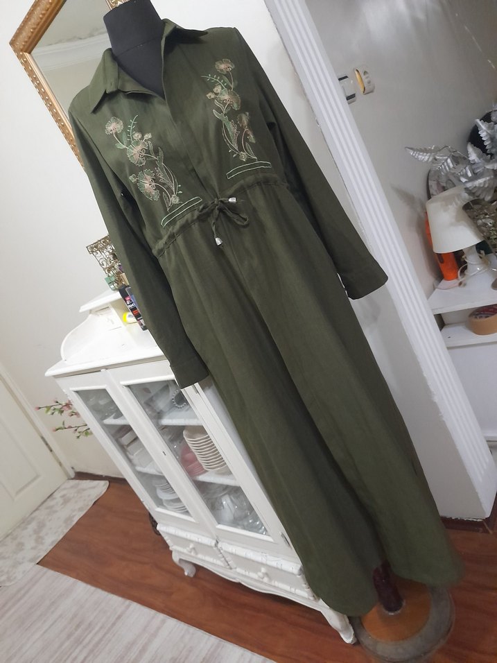 Uzun, haki renkli keten , uzun kollu ve nakışlı detaylara sahiptir. Kemerli ve bol kesimdir, bohem tarzı yansıtır.Elbise yada dış giyim olarak kullanılabilir esnemeyen kaliteli kumaş Gögüs 48 omuzdan büzme yeri başlangıcı boy 35 bel büzgü ile ayarlanabilir büzgüsüz hali tek yön 50 boy 130 içte etekte 4 cm pay var dügmeleri dikilmemiş alana bir paket düğme içine koyarım kaliteli şık yeni üründür beden aralığı var ölçülere bakıp alın lütfen