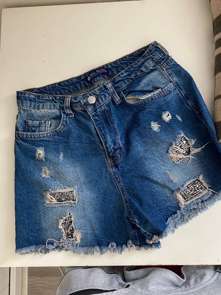 Nakış detaylı, kemerli ve bol kesim kot şort. Koyu mavi renk ve kısa boyuyla sokak stiline uygun.