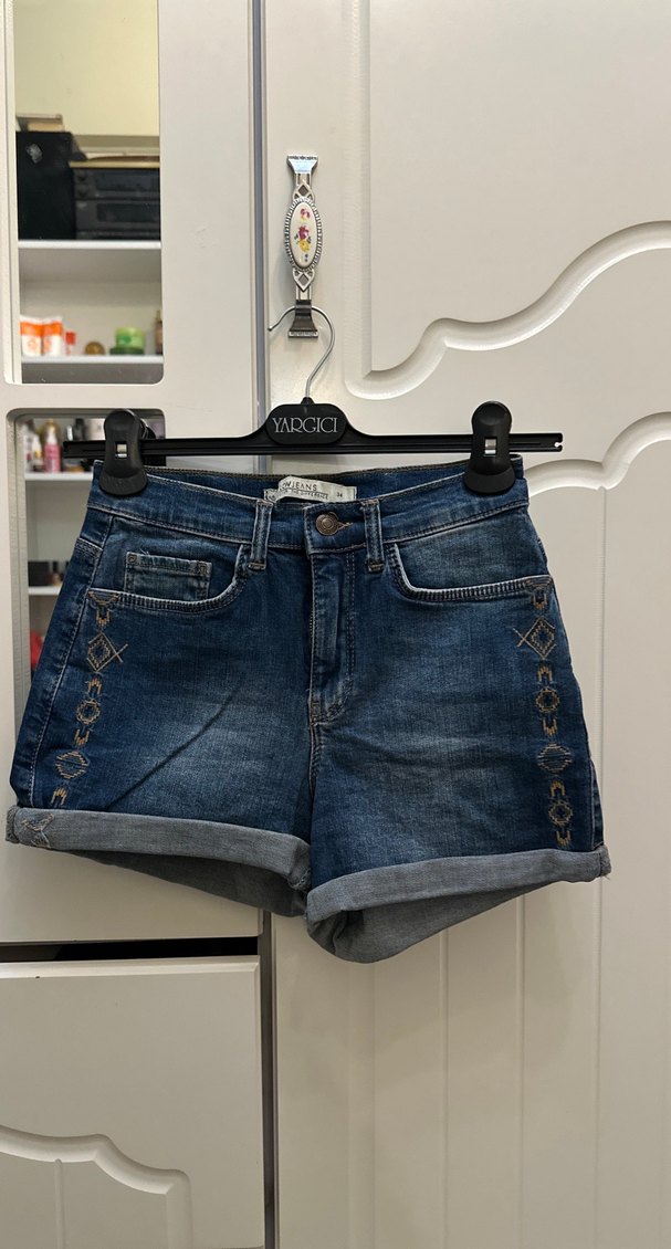 Koyu mavi renkli kot şort, yanlarda nakışlı desenler ve kemerli detay ile rahat bir kesime sahiptir. Günlük sokak stili için uygundur.