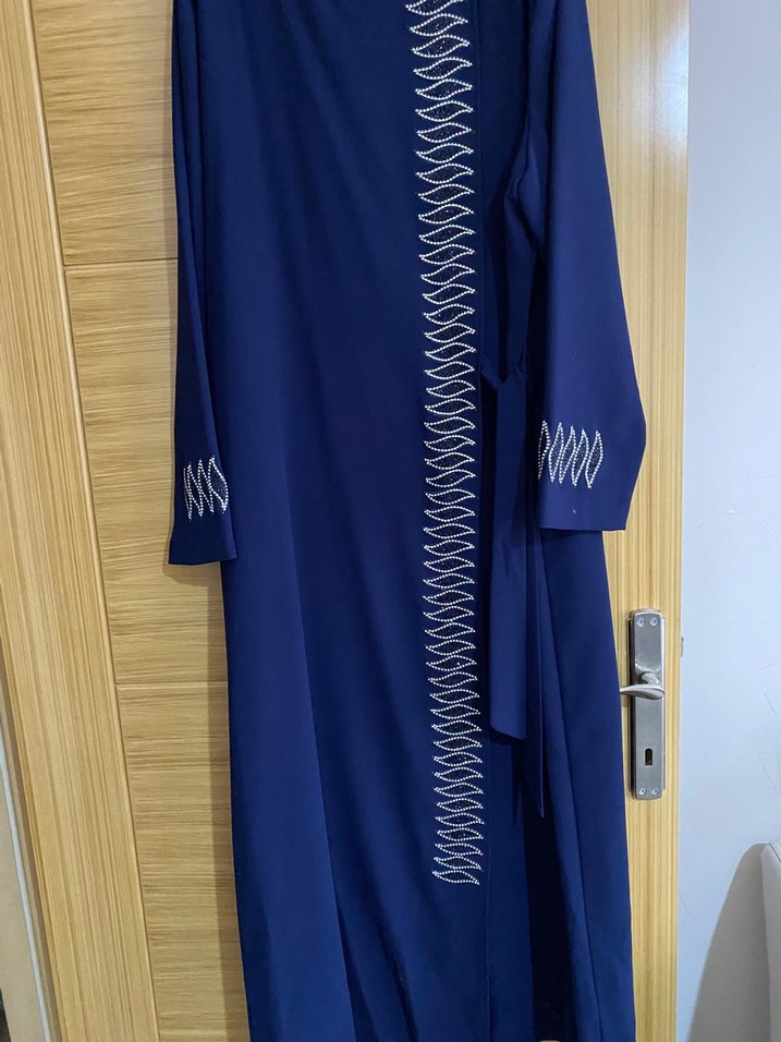Nakışlı detaylara sahip, kemerli ve notalı yakalı uzun lacivert elbise. Sentetik kumaştan olup, uzun kolludur. Günlük kullanıma uygundur.