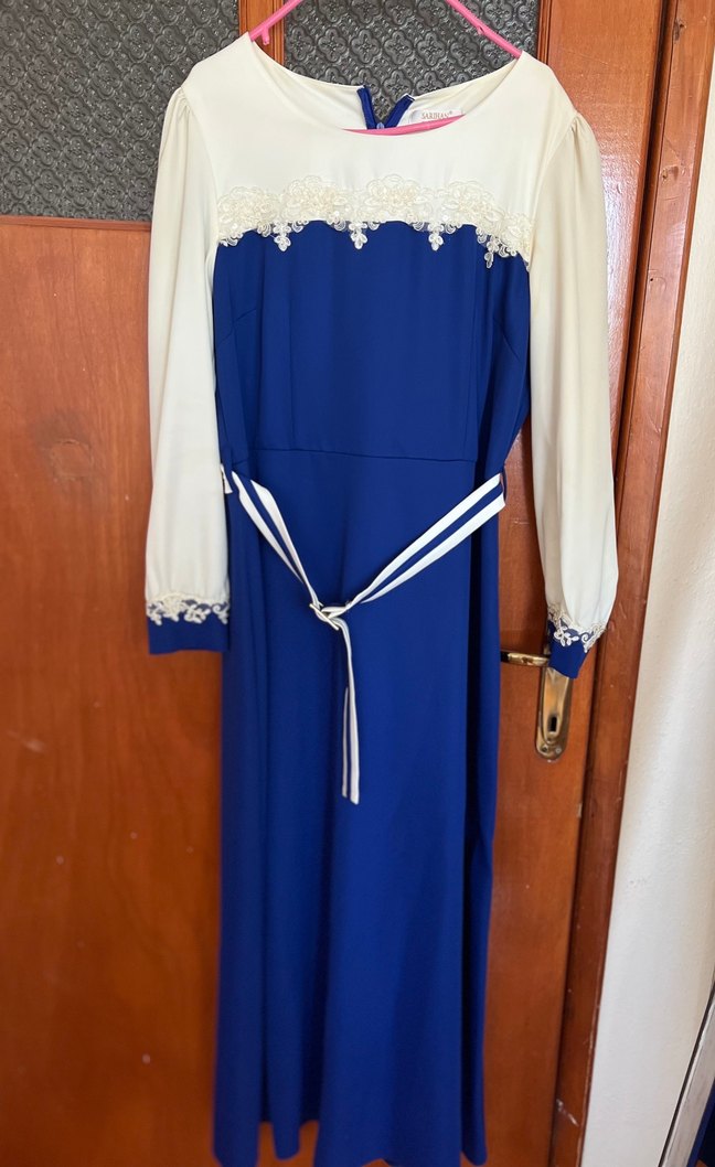 Uzun kollu, nakışlı detaylara ve kemerli bele sahip açık mavi uzun elbise. Yuvarlak yakalı ve rahat kesim vintage tarzda.