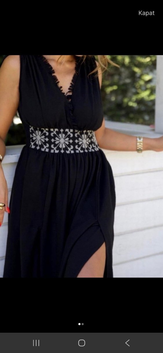 V yaka, askılı kollu, nakışlı kemerli ve bohem tarzda siyah uzun elbise.