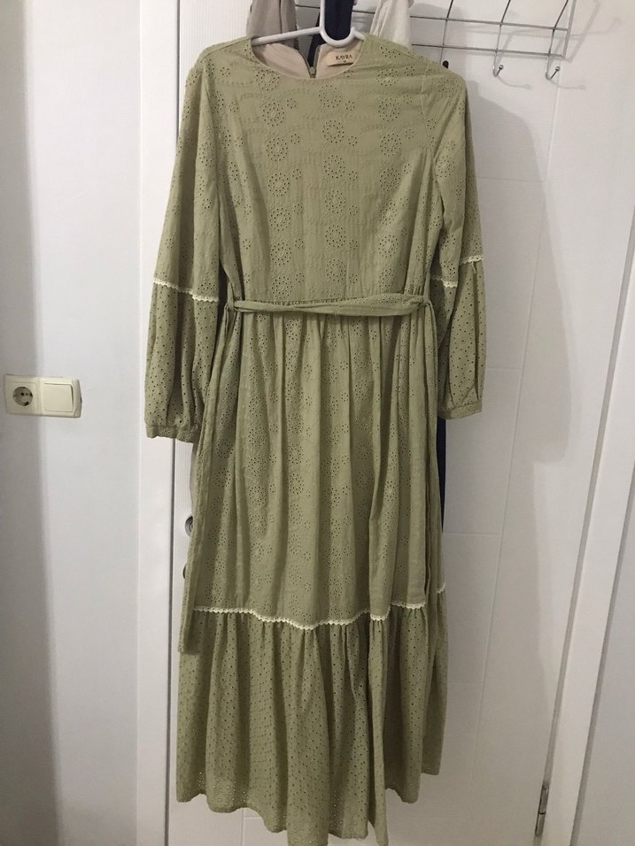 Nakış detaylı, kemerli keten uzun elbise. Uzun kollu ve yuvarlak yakalı, rahat kesim ve yumuşak haki renkte.
