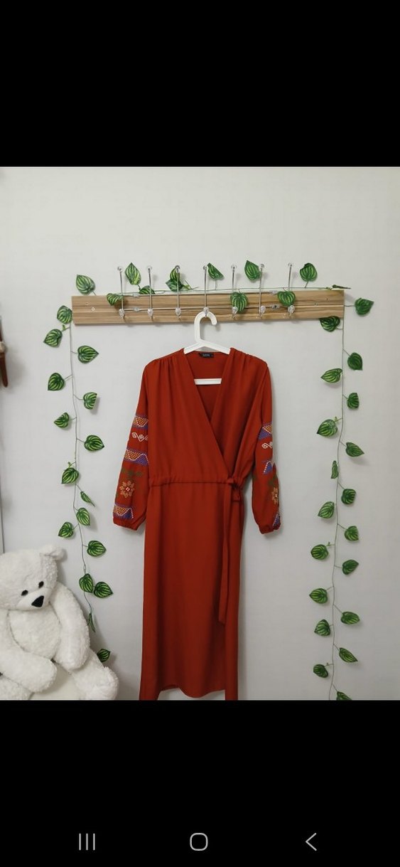 38 40 beden uyumlu Uzun kırmızı elbise, bol kesim ve uzun kollu. Kollarında nakış desenleri bulunur, V yakalı ve kemerli. Yumuşak dokulu kumaştan, günlük kullanıma uygun. kol ucu lastikli belden bağlamalı