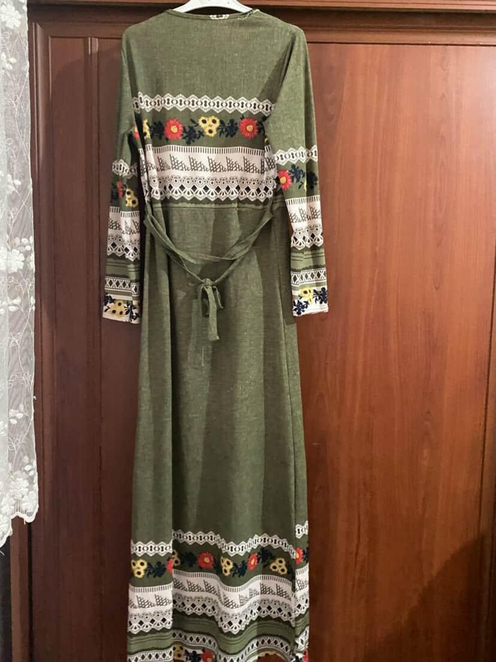 Uzun elbise, yuvarlak yaka ve uzun kolludur. Çok renkli nakış desenleri ve kemer detayı vardır. Günlük kullanıma uygundur.